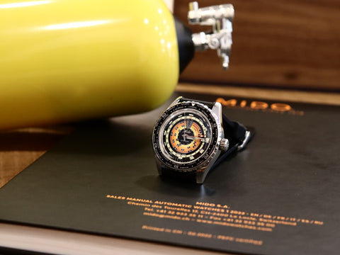 Mido nous propose un modèle haut en couleur avec cette Ocean Star Decompression Worldtime, aux allures vintages et prononcées.