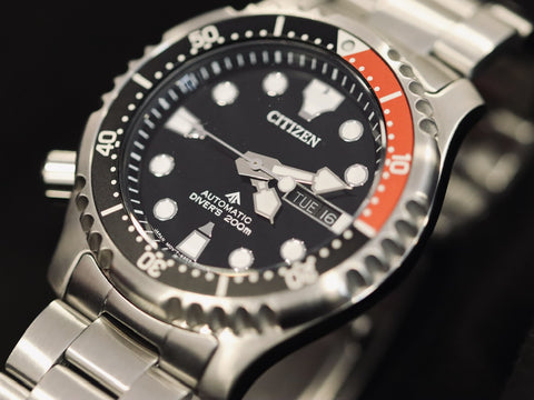 Pour démarrer la sélection, on vous laisse admirer cette Citizen Promaster Diver Automatique, le petit bonbon de cette sélection. Équipée d’une boite et d’un bracelet en acier inoxydable, elle offre un sentiment de solidité tout en conservant une certaine légèreté. Sa forme homogène épouse le poignet et laisse les détails ressortir. Que ce soit la lunette unidirectionnelle ou ses index blancs posés en applique, elle a tous les atouts d’une plongeuse avec sa couronne vissée à 8 heures. On retrouve une indication de jour et de date à 3 heures.