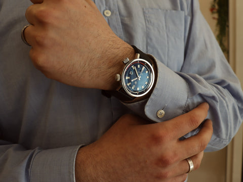 La boite en acier de 40mm fait d’elle une montre qui s’adapte à tous les poignets, ni trop grosse, ni trop petite. Avec son alternance de polissage miroir/brossé et son verre saphir bombé elle offre de beaux reflets à la lumière du soleil. Pour passer un été serein on retrouve une lunette noire unidirectionnelle avec un insert en aluminum, une couronne vissée et un fond également vissé pour assurer l’étanchéité de cette petite plongeuse. Son cadran bleu, sa date discrète à 6h et ses index posés en applique patinés appuient le côté vintage et nous rappelle son héritage. Le bracelet en acier inoxydable en 3 mailles mesure 20 mm d’entre-corne et se distingue par sa finesse qui offre un véritable confort au porté.