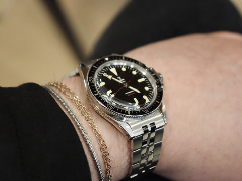 La Divers Sixty-Five d’Oris est la dernière montre de cette sélection, on vous a gardé le meilleur pour la fin. Toujours dans une optique de faire revivre des succès d’antan, Oris réédite un modèle mythique de la marque. Lancée en 1965, la première plongeuse d’Oris connait un succès qui gravera le fameux sixty-five dans la liste des réussites de la manufacture.
