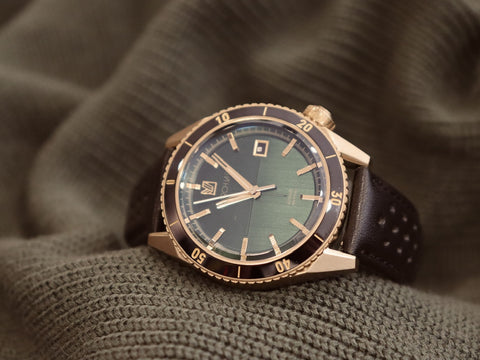 L’un des avantages du bronze c’est qu’il patine vite suivant votre usage. L’oxydation du bronze tourne au vert ce qui offre un style nautiles de Jules Verne. 100% personnalisé par vous et votre usage de la montre.