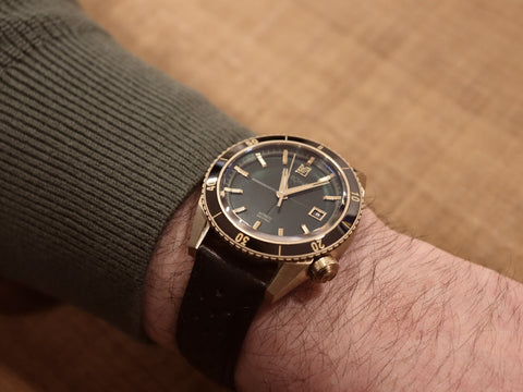La plus grande de cette sélection, cette Bonzer mesure 41mm de diamètre avec une lunette unidirectionnelle en céramique et un cadran soleil vert comme March LaB sait si bien les faire. La montre est montée sur bracelet en collet végétal avec une taille d’entre-corne de 20 mm. Détail peut être mais qui a son charme, le chiffre 3 du dateur situé à 4h est peint en vert, petite signature de la marque.