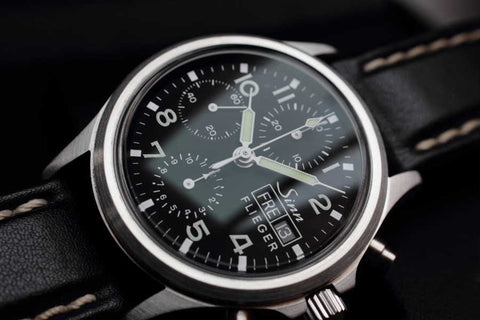 Une forme pentagonale avec une pointe évasée est utilisée pour une lisibilité simple et efficace. Ce type d’aiguille se retrouve aussi bien sur la version fine de la montre classique que sur la version large de la montre typée pilote.