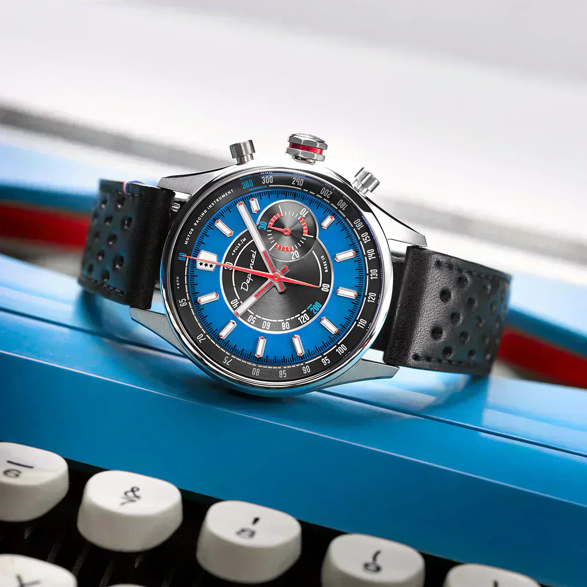 La Allure Valjoux 92 Bleu de France arbore un boîtier en acier inoxydable 316L de 39 mm de diamètre, avec une finition brossée et polie. Son cadran bleu brillant, rehaussé de détails rouges, évoque les voitures de course classiques et le glamour des années 60. Le verre saphir bombé et le fond transparent offrent une vue imprenable sur le mouvement restauré. La montre est équipée d’un bracelet en cuir noir perforé avec des surpiqûres assorties, complétant ainsi son allure sportive et élégante.