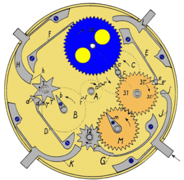 Ces phases sont animées par un disque avec 2 lunes gravées dessus, souvent entrainée par une roue de 59 dents puis un doigt engrène la roue d’une dent toutes les 24 heures. La durée de la lunaison affichée de ce système est donc de 29,5 jours, ce qui provoque un léger décalage d’un jour dans le calendrier lunaire tous les 2 ans, 7 mois et 20 jours.