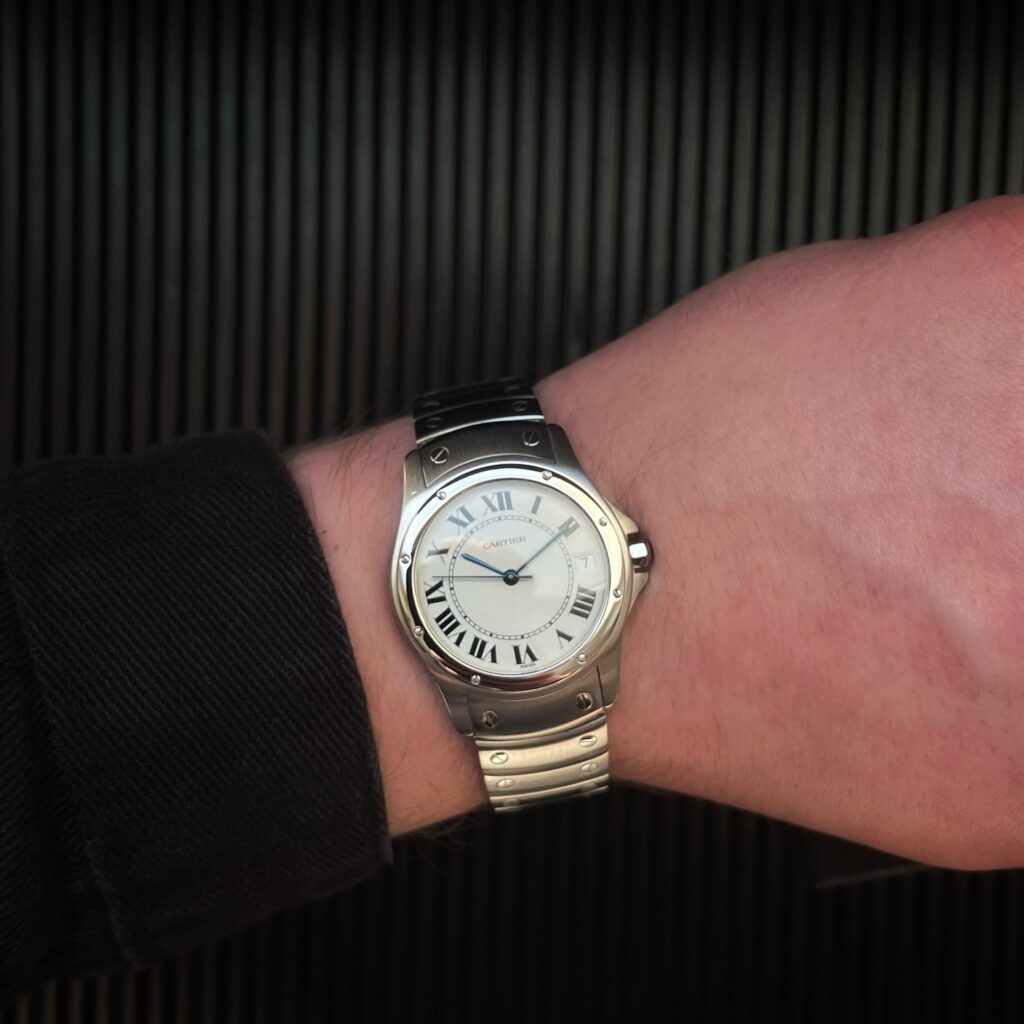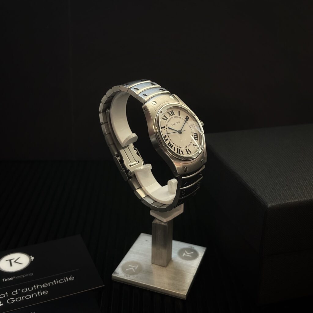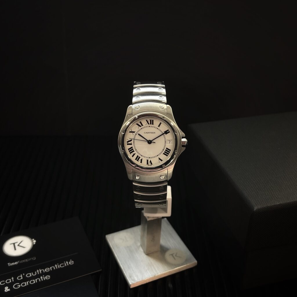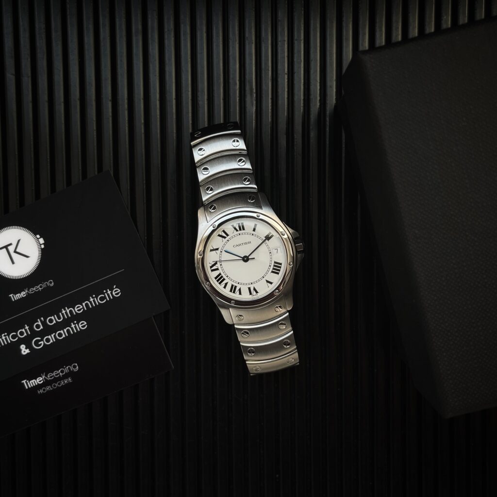 La Cartier Santos Ronde réf. 1920-1 en 33 mm est une montre-bracelet élégante qui incarne le savoir-faire et le design intemporel de la maison Cartier. Son boîtier rond de 33 mm en acier inoxydable, associé à un bracelet en acier de haute qualité, offre un confort optimal au poignet. Le cadran épuré, orné de chiffres romains caractéristiques et d’aiguilles bleuies en forme de glaive, reflète l’esthétique classique de Cartier.
