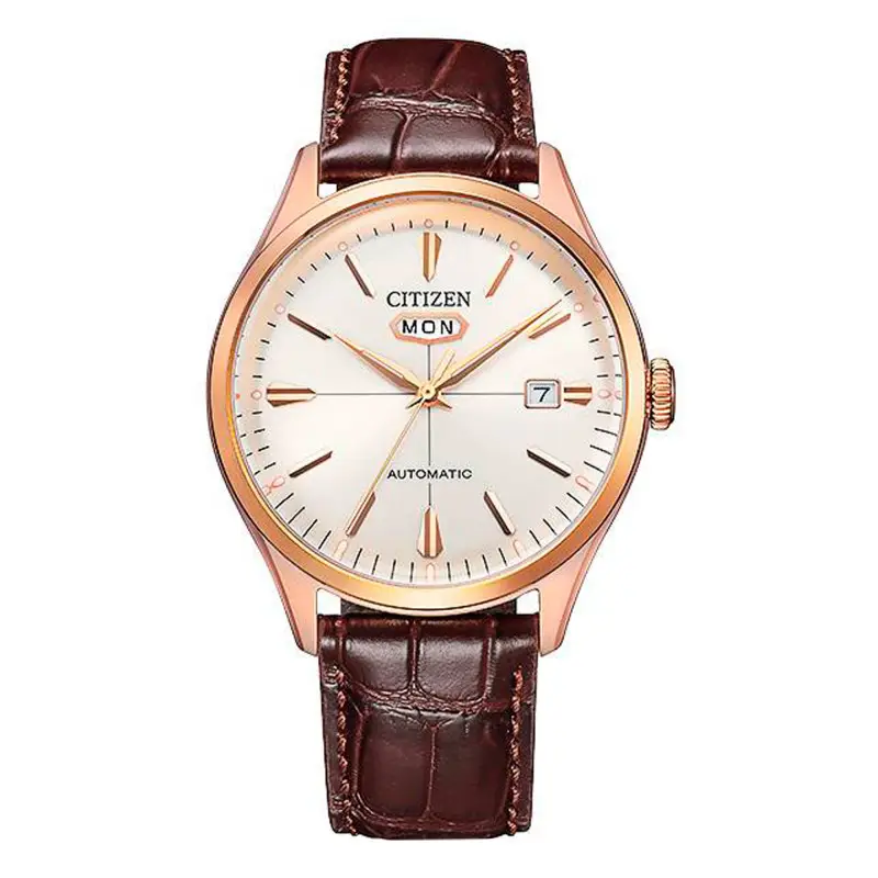 Avec son imposant cadran rond de couleur blanc, qui respecte toutefois les courbes d’un poignet masculin de petite taille, cette montre vous indiquera les heures par des index assortis avec une mention spéciale, pour les points cardinaux de la journée, à savoir les 12h, les 3h, les 6h et les 9h, qui eux, possèdent des index pointus. Au sein de son cœur, trois aiguilles sont disposées, les deux plus larges sont munies d’un revêtement luminescent, tandis que la plus fine, la trotteuse des secondes est, elle, en acier de couleur argent. Vous trouverez également sur ce cadran, un chemin de fer des minutes et un guichet double élégamment conçu, à date (à 3h) et jour (à 12h). Le nom de la manufacture japonaise est apposée à 12h, et la mention “automatic”, figure verticalement, à 6h.