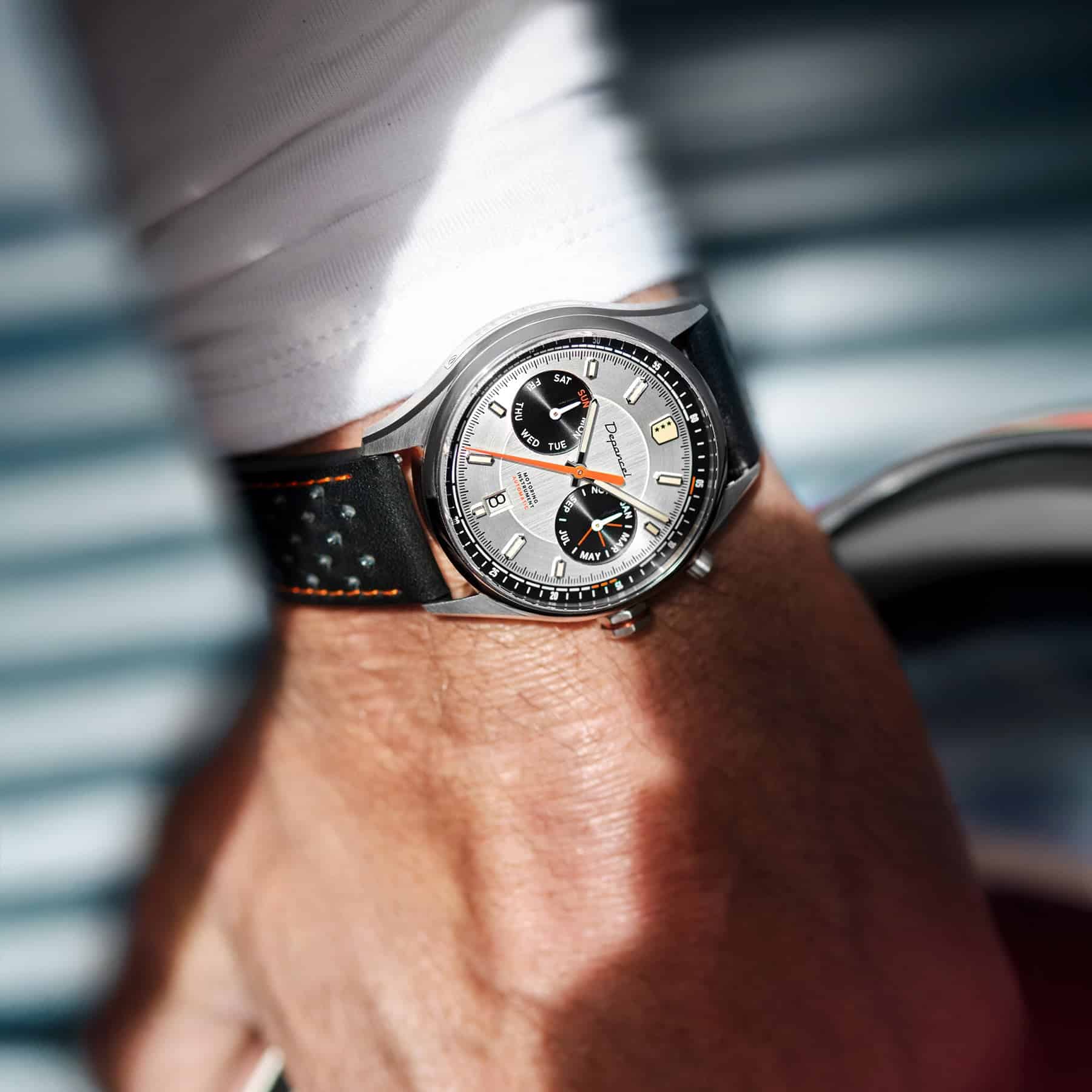Le boîtier de la Autosport arbore un boîtier en acier inoxydable de 39mm, aux lignes épurées et aux finitions méticuleusement réalisées. Sa lunette polie contraste subtilement avec le brossage circulaire des cornes, tandis que les flancs affichent un brossage horizontal et des arêtes supérieures polies. La montre est parée d’un verre saphir double dôme offrant un jeu de lumière et une profondeur unique au cadran.