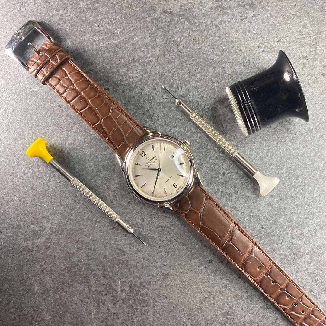 Heritage 1948 Gent Automatic, 40 mm, Polished and brushed stainless steel case, testa di moro brown alligator leather, pin buckle, light silver sun-brushed dial.