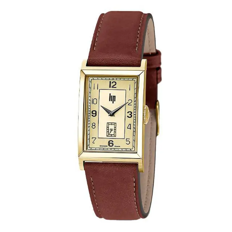Le cadran que la maison Lip vous propose est d’une forme carrée très originale. Il présente une finition à double cerclage, ou plutôt double carré. Le premier cadran est d’une teinte dorée foncée, tandis que le second est légèrement plus clair. Au centre de ce cadran, vous apercevrez deux aiguilles dauphine noires qui marquent les heures et les minutes avec précision. Elles ajoutent une touche d’élégance et rehaussent la beauté de ce cadran. Autour de ce cadran, un chemin de fer des minutes avec des chiffres arabes facilite la lecture de l’heure. Pour le décompte des secondes, un petit compteur est placé juste au-dessus de l’index de six heures. Enfin, la marque inscrit son nom sous l’index de midi, rappelant que ces montres sont fabriquées en France.