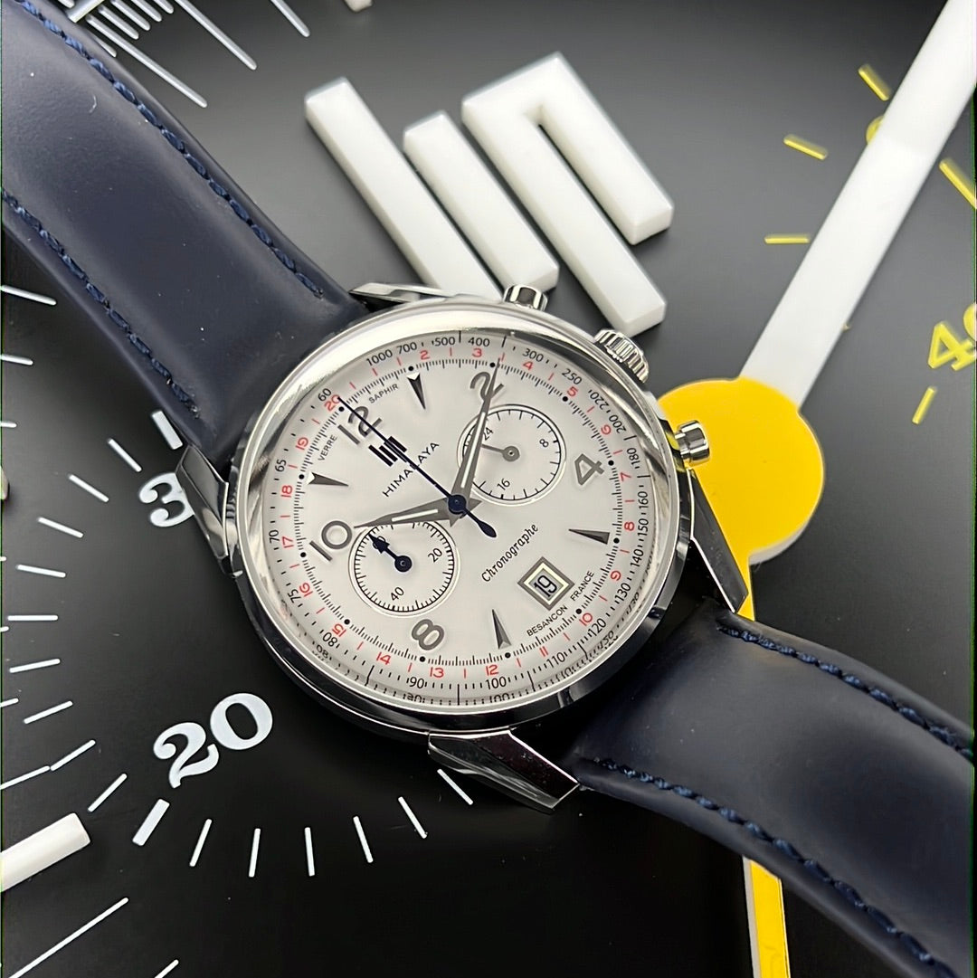 blanc argenté, chiffres, index, dateur à 6 h et compteurs argentés, aiguilles heure et minute argentées lumineuses, trotteuse bleue foncée