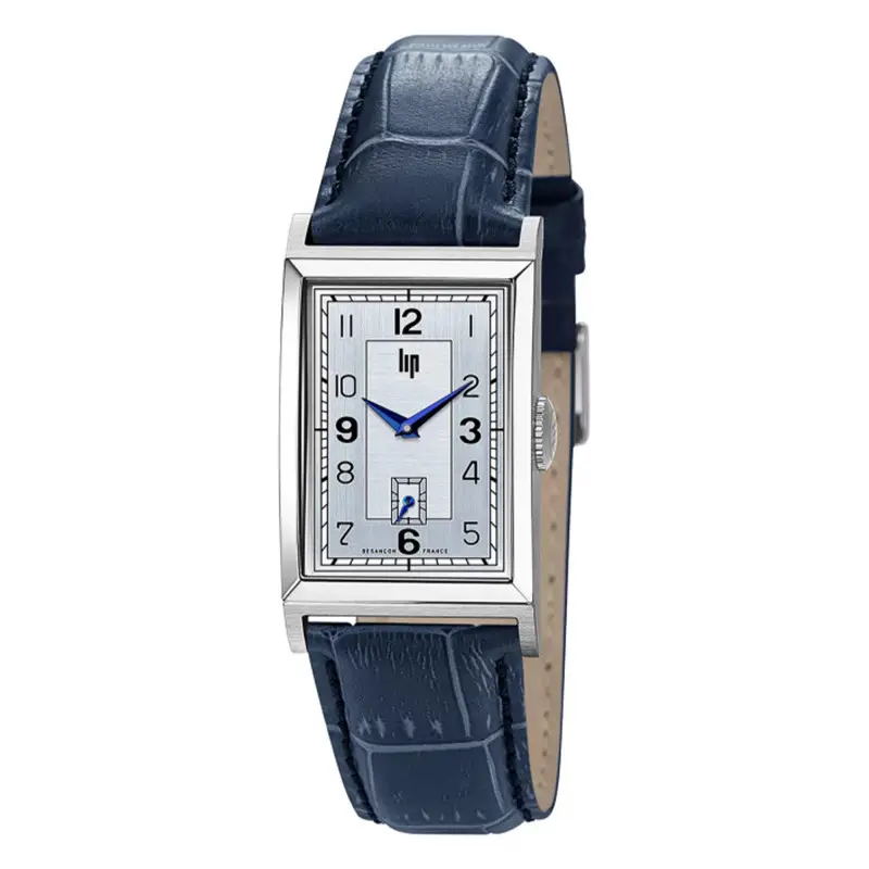 La T24 arbore un cadran rectangulaire de teinte argentée. Les heures et les minutes sont indiquées par deux aiguilles dauphines bleues sur un affichage analogique. Un compteur des secondes, discret, est situé à six heures. La lecture des heures est simplifiée grâce à des index en chiffres arabes noirs. Les index des positions 3, 6, 9 et 12 sont particulièrement accentués par leur épaisseur. Ces index sont accompagnés d’un élégant chemin de fer des minutes s’étendant autour du cadran. Enfin, la marque horlogère française LIP appose sa signature sous l’index à douze heures, tout en mentionnant sa fabrication à Besançon à six heures.