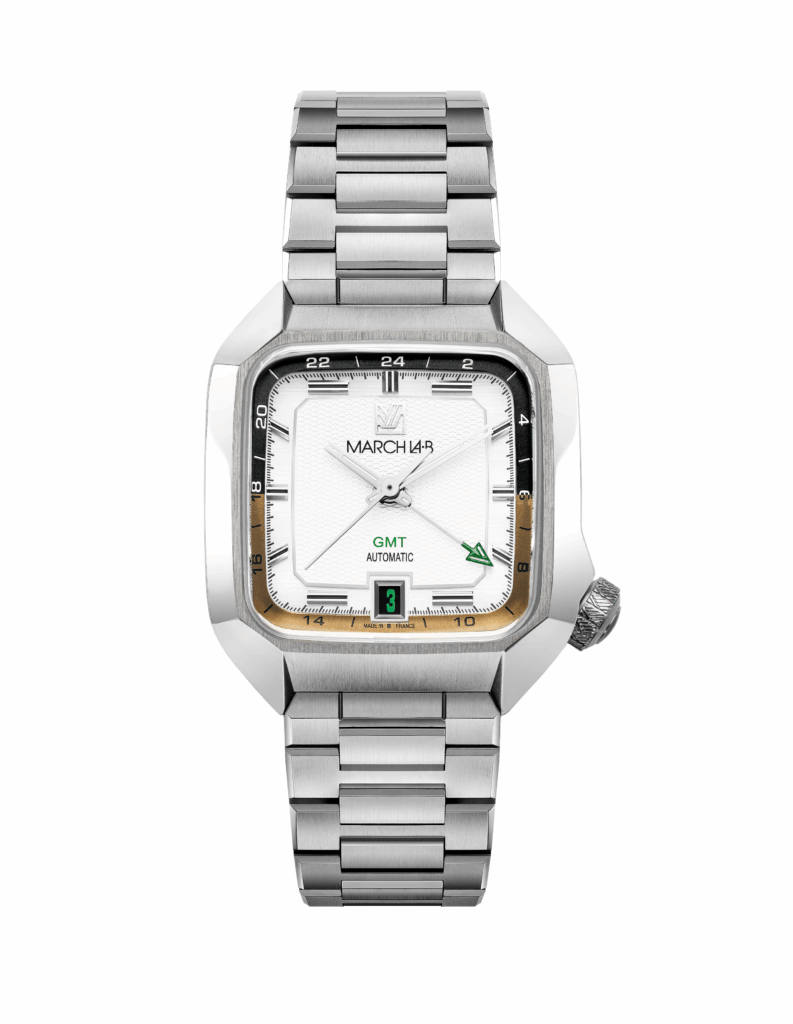 Son nouveau cadran texturé reprenant les index à bâtons signatures de la famille AM2 est encerclé des différents fuseaux 24 Heures. L’aiguille GMT verte et perforée complète les désormais classiques aiguilles diapasons identifiées March LA.B.