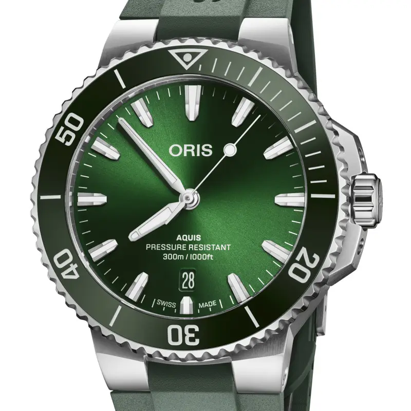La Maison Oris relance son modèle à succès : l’Aquis Date, la montre de plongée aussi élégante que polyvalente. Avec son cadran vert et son bracelet caoutchouc, cette montre de 41,5 mm vous séduira par son authenticité !