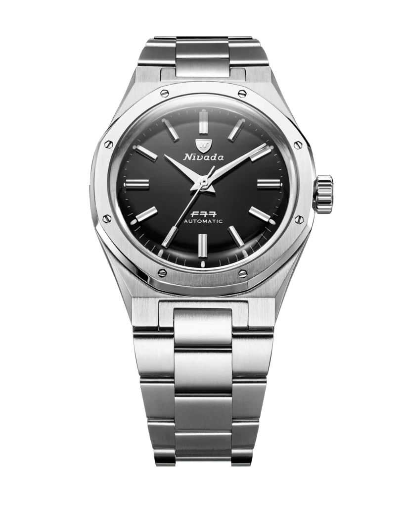 Avec son diamètre contenu de 38 mm, la F77 Black séduit les puristes à la recherche de proportions néo-vintage. Le boîtier anguleux et le bracelet intégré lui confèrent une identité forte, rappelant les grandes icônes sport-chic des années 1970. Le cadran noir apporte profondeur et originalité. Compacte mais affirmée, cette montre s’impose comme une alternative crédible aux références helvétiques plus onéreuses.