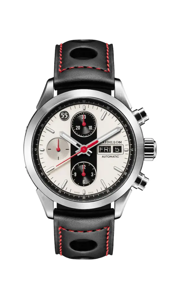 Son boîtier en acier inoxydable mesure 39 mm et présente une forme à la fois équilibrée et sportive, accentuée par ses finitions brossées et une structure solide adaptée à un usage quotidien. Le cadran, influencé par le style des voitures de compétition, en particulier le concept Ferrari Modulo, se caractérise par une composition dynamique avec des contrastes marqués, une typographie inspirée des courses et des éléments graphiques qui rappellent la vitesse et la précision. Les sous-cadrans du chronographe, intégrés avec soin, garantissent une lecture claire et fonctionnelle, fidèle à l’idée d’un instrument de bord.