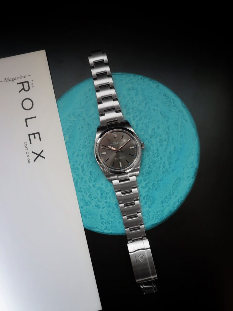 Son cadran gris élégant, à la finition sobre et raffinée, met en valeur les index appliqués et aiguilles luminescentes, garantissant une excellente lisibilité de jour comme de nuit. L’absence de date renforce la pureté du design et souligne l’esprit originel de la collection Oyster Perpetual.