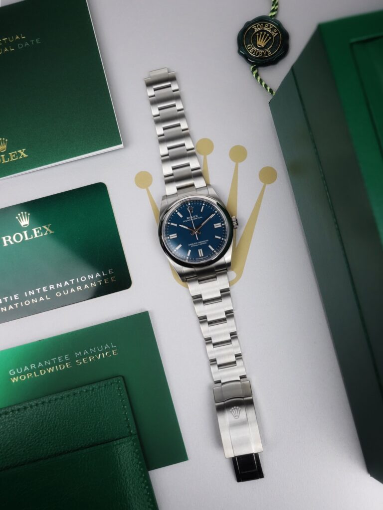 Avec son boîtier Oyster de 36 mm en acier Oystersteel, à la fois compact et bien proportionné, elle offre une élégance qui convient à tous les poignets. Étanche jusqu’à 100 mètres, elle assure une résistance optimale face aux aléas du quotidien. Le cadran bleu soleillé, particulièrement prisé, présente des nuances lumineuses variant du bleu sombre à des reflets plus éclatants selon l’angle, le résultat d’un processus de laquage et de finition parfaitement maîtrisé. Les index appliqués ainsi que les aiguilles luminescentes en Chromalight garantissent une excellente lisibilité, de jour comme de nuit.