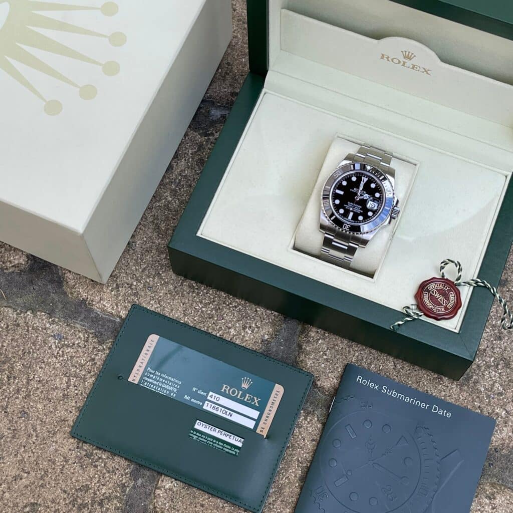 • Montre neuve : elle est issue directement du réseau officiel, jamais portée, livrée avec son écrin d’origine, sa carte de garantie internationale et ses papiers complets.