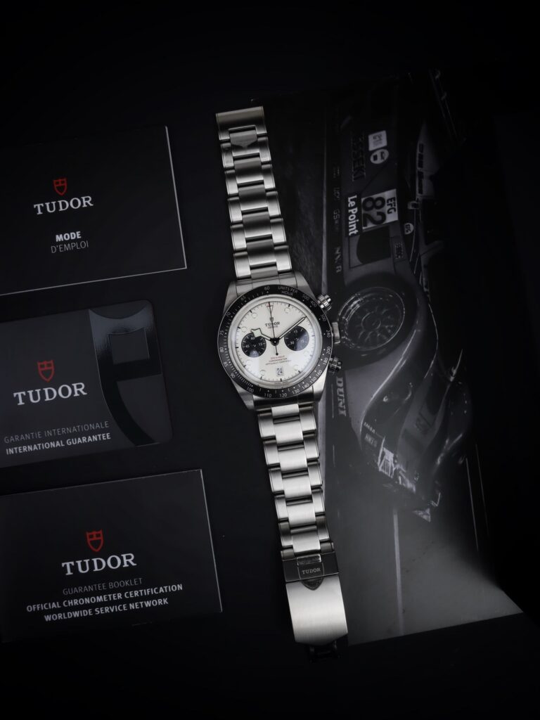 Son boîtier en acier inoxydable de 41 mm, aux finitions satinées et polies, offre une présence équilibrée et élégante au poignet. Le cadran noir profond, sublimé par des compteurs contrastés “panda inversé”, assure une lisibilité remarquable et un style résolument sportif. Les célèbres aiguilles “Snowflake”, signature de Tudor, sont revêtues de matière luminescente, garantissant une lecture optimale en toutes conditions. La lunette fixe avec échelle tachymétrique renforce son ADN de chronographe de précision.